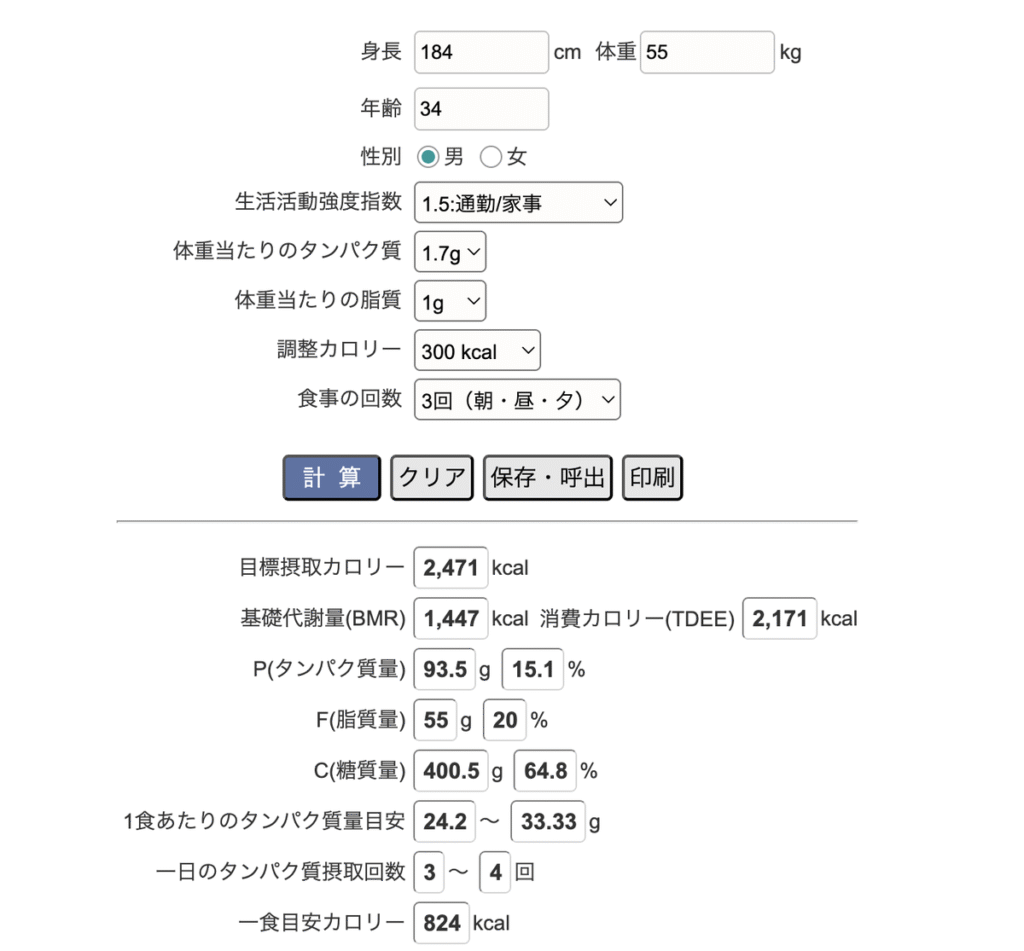 私が当時の体重(55kg台)で計算したところ、2,500〜3,000kcalを摂取すれば体重が増えていくと分かりました。